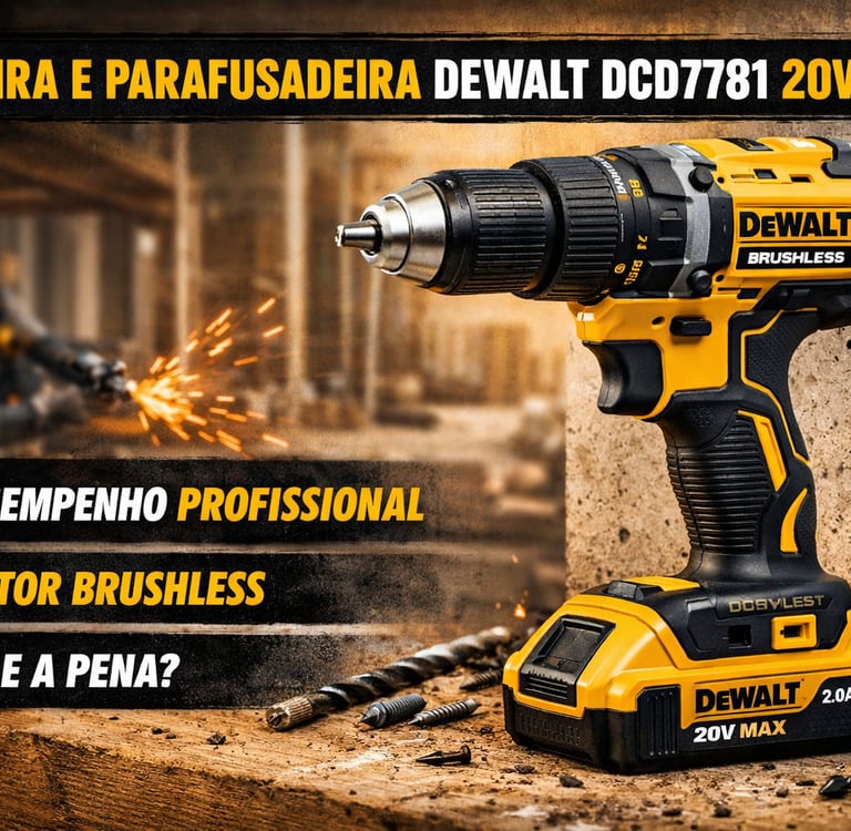 Review técnico completo da Furadeira e Parafusadeira DeWalt DCD7781 20V MAX Brushless. Veja torque, potência, desempenho em madeira, aço e concreto, comparativo com concorrentes e análise de custo-benefício para uso profissional.